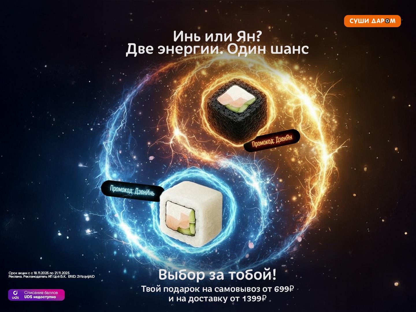 Твой вкус всегда знает, что ему нужно .[br]Внутри тебя уже есть ответ. просто доверься ощущению и смотри, что откликается:[br][br][emoji=:white_heart:]Спокойный, мягкий, хочется тишины в голове — ты про Инь.[br]Нежный белый ролл: лёгкий вкус, чистый вайб, мягкая энергия «я в своём маленьком космосе».[br]Это тот выбор, который успокаивает, собирает и делает всё вокруг чуть светлее.[br][br][emoji=:black_heart:]Хочется ярче, контрастнее, по-настоящему “ух” — это Ян.[br]Чёрный ролл с характером: глубина, выразительность, смелый вкус, который заявляет о себе сразу.[br]Это выбор, когда нужен драйв, акцент, эмоция и то самое ощущение “живу!”.[br][br][emoji=:heart_eyes:] И да — ролл, который совпал с тобой, ты получаешь в подарок назвав промокод: ДзенИнь или ДзенЯн[br][br]* Акция действует с 18.11.2025-21.11.2025[br]**Количество товара ограничено; актуальное наличие и состав уточняйте на сайте/в приложении или у оператора.[br]*** Недоступно списание бонусных баллов.[br]**** Акция не суммируется с другими подарками.